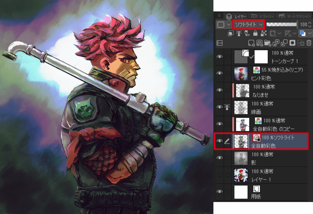 あとあっと クリスタの自動彩色やってみた これでもかと適当に塗ってみたけど彩色できてる すごい 最後オーバーレイレイヤーで適当に色のせて調整してます